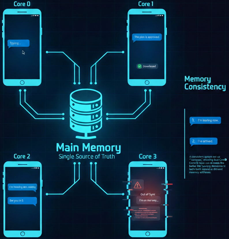 Today, I want to talk to the students who are curious about this field. When you start learning about multi-core systems, the terms Cache Coherence and Memory Consistency always seem to get tangled up. Let’s untangle them using something you use every day: a Group Chat.